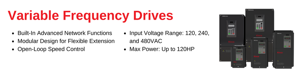 Kinco Automation carries a broad line of rugged AC Variable Frequency Drives for OEM and Industrial applications, combining high performance and cost efficiency into one powerful package. Available in input voltages of 120V and 240V and capable of powering AC motors from 0.25 to 30Hp, these VFDs are great for normal duty and soft-start operation. These drives provide energy savings and increased efficiency, making them ideal for fan, pump, and HVAC applications. They are equipped with a number of different features such as momentary power loss restarts, flying starts, auto-acceleration/deceleration, and sensorless vector control. These features make the VFDs compatible with most AC motors and allow for flexibility within an application. If you require assistance in selecting the appropriate VFD for your application, please contact an Anaheim Automation Applications Engineer, we are happy to help.