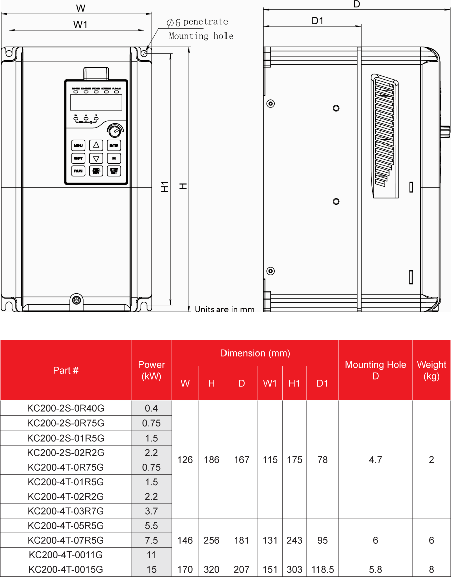 The KC200 series is a universal vector VFD that is mainly used to control and adjust the speed and torque of Three-Phase asynchronous motors. With its superior independent air duct design it has many benefits such as convenient installation, easy wiring, tremendous heat dissipation, top of the line performance and comprehensive protection. The KNC-VFD-KC200 series is a complete system, process oriented and strict in the development process of software, hardware, and structure, with attention to detail and the user experience. These VFD’s can be used for light load, heavy load, extremely heavy load equipment such as lifting, cement, rubber tires, industrial water treatment, fan ventilation systems, stirring, air conditioner cooling systems, wood working machinery, and various automated production equipment. The KNC-VFD-KC200 series is mainly used to control and adjust the speed and torque of Three-Phase asynchronous motors.